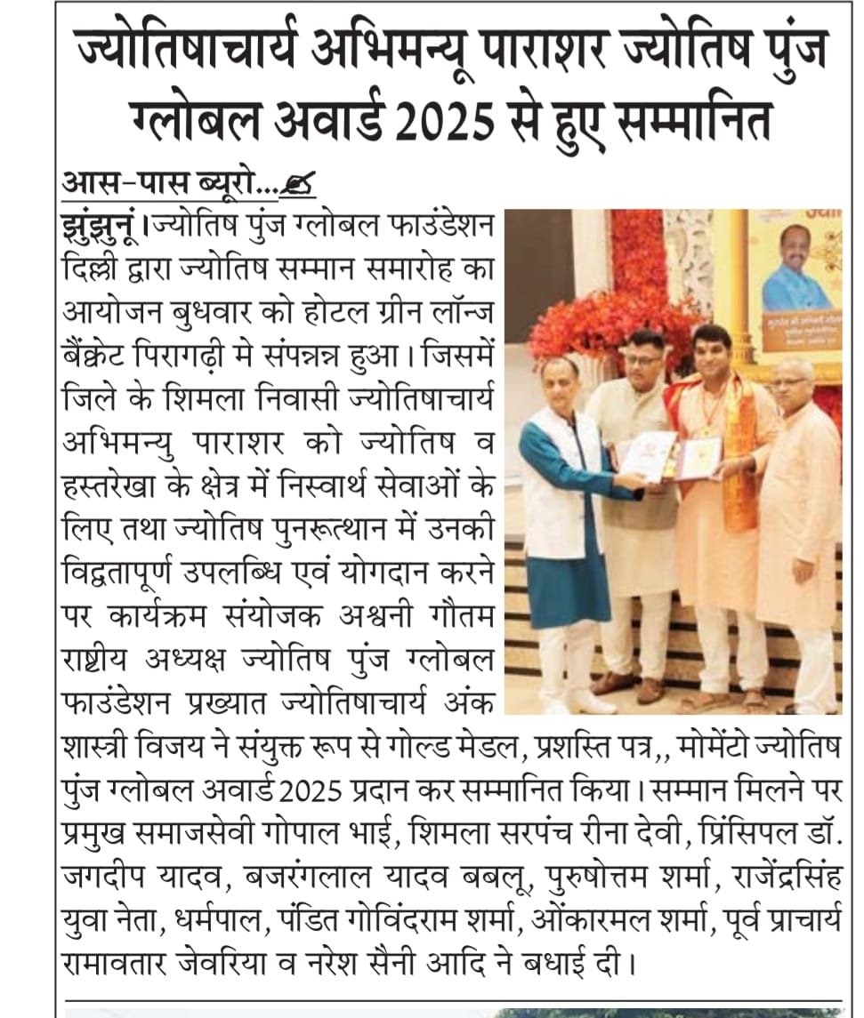 राजस्थान की पवित्र धरती झुंझुनूं ज़िले के खेतड़ी तहसील के गाँव शिमला में जन्मे ज्योतिषाचार्य अभिमन्यू पाराशर आज उस ऊँचाई पर हैं जहाँ से उनकी पहचान न केवल भारत में, बल्कि अंतरराष्ट्रीय स्तर पर एक विद्वान, ज्योतिषाचार्य, साहित्यकार और समाजसेवी के रूप में की जाती है।